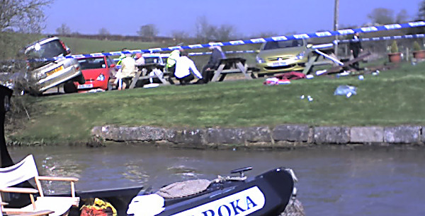Eight police vehicles and a car parked ON TOP of another one having smashed two tables and narrowly missed going into the canal.